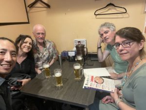 先にご飯を食べに行っていたFlook、キャシー・ジョーダン、プランクトンの川島恵子さん、ミュージック・プラントの野崎洋子さんにイタリアンのお店に合流する?とメールでお誘いを頂きつつも間に合わず、結局マットの他に、シボーン・ピープル、ジョニー・オグ・コノリー、女性ディレクターも合流して天麩羅と天丼がメインの居酒屋へ。